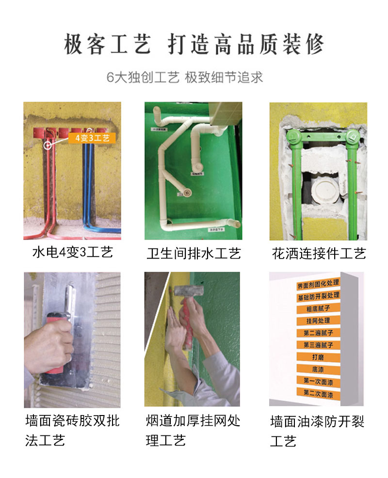 解決痛點: 降低墻體和瓷磚因熱脹冷縮引起的瓷磚空鼓掉落華美樂全國首家全屋使用界面劑加固工藝,有效增強原基礎(chǔ)沙漿層的強度。同時增加原墻的附著力,刷漆或貼磚更加牢固華美樂獨創(chuàng)墻面掛網(wǎng)工藝,墻面批第一遍膩子干透前,對原墻面的開裂進行修復(fù),然后全屋滿布玻璃纖維網(wǎng),再批第二遍膩子覆蓋。