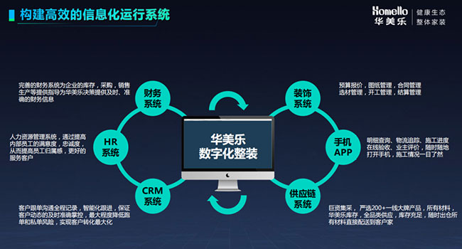 華美樂(lè)花費(fèi)了數(shù)十年時(shí)間開(kāi)發(fā)了一套全面打通的數(shù)字化整裝系統(tǒng),包含財(cái)務(wù)系統(tǒng)、HR系統(tǒng)、CRM系統(tǒng)、整裝系統(tǒng)、手機(jī)APP、供應(yīng)鏈系統(tǒng)。