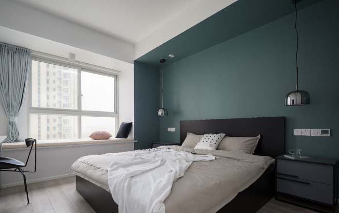 主臥空間簡(jiǎn)約舒適,藍(lán)色系與白色系營(yíng)造出舒緩放松的氣氛,布藝雙人床配合柔軟的大地色系紡織品,產(chǎn)生一種溫暖的力量將人包裹??繅μ幏胖昧俗雷?,女屋主可以在這里梳妝,或是睡前看看書(shū)。