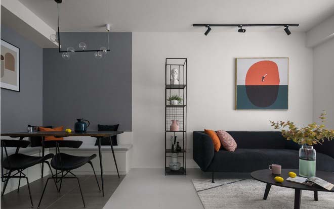 考慮到空間面積偏狹小,因此硬裝偏向簡(jiǎn)約。頂面采用局部吊頂,配合明裝射燈、筒燈,更顯簡(jiǎn)潔大氣。沒(méi)有擺放過(guò)多的家具,只選用了輕盈的三人位沙發(fā),單人沙發(fā)、鐵藝置物架,留出更多的空間自由活動(dòng)。