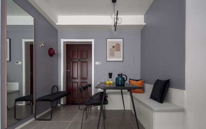 考慮到入戶區(qū)域較為狹窄,摒棄了傳統(tǒng)頂天立地的大鞋柜,采用L形的卡座,滿足鞋子收納的同時(shí),也便于多人同時(shí)就餐??繅σ粋?cè)安裝了掛鉤、全身鏡,還配置了換鞋凳,以后有了小孩,居住人口變多,還可以將換鞋凳搬走,購(gòu)買薄款鞋柜,擴(kuò)充儲(chǔ)物空間。