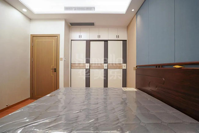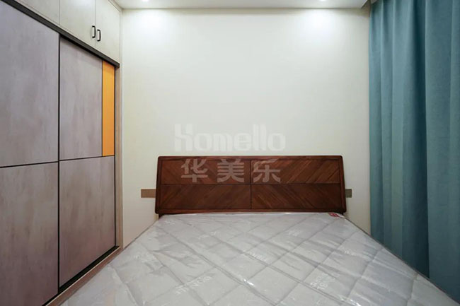 臥室背景墻用簡單顏色軟包設(shè)置,床頭顏色與窗簾軟裝相呼應(yīng),令空間有更加精美柔和!