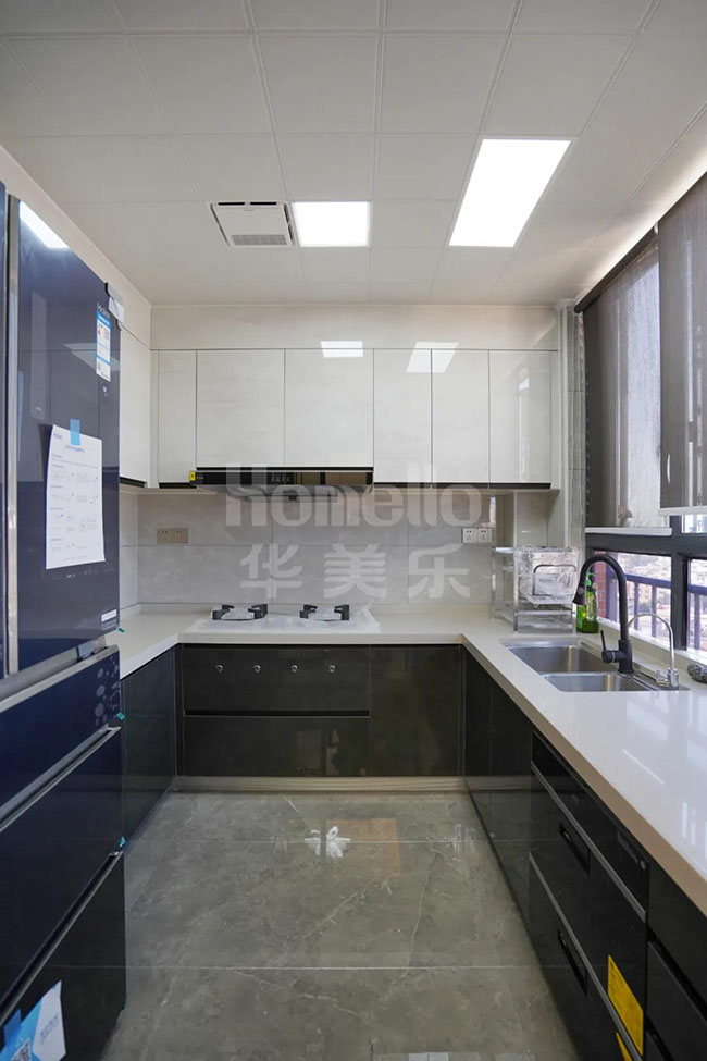 廚房里同色系的地柜和白色吊柜,看起來很簡約整潔,光滑的柜面,為清潔便利性加分!