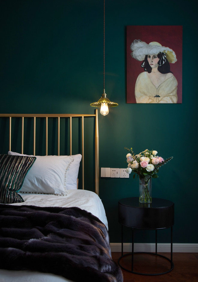 ▲時尚就是一個輪回,墨綠色的墻面,原本多見于五六十年代,近年卻復古回潮,深受喜愛。主臥使用了深邃的暗色調,整面的墨綠色墻面奠定復古基調,金色豎紋床架線條流暢簡潔,金色和墨綠色搭配的抱枕前后遞進,墻上則選擇了野獸派創(chuàng)始人亨利·馬蒂斯的古典肖像畫。