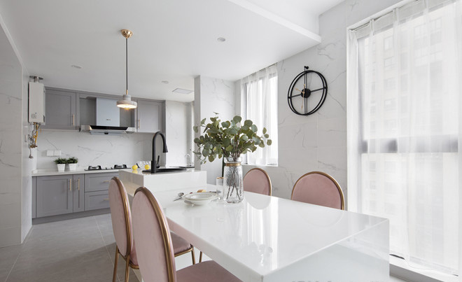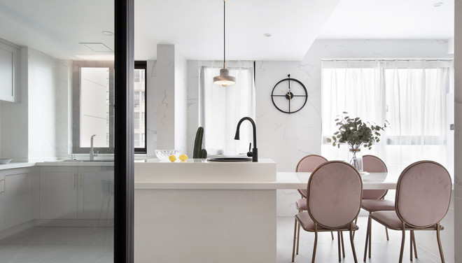 ▲餐廳與廚房在同一個空間里,延續(xù)了基礎色調,白色大理石的空間,幾張粉色的餐椅,調和空間溫暖的氛圍。設計師精心的挑選了室內的每一件家飾。