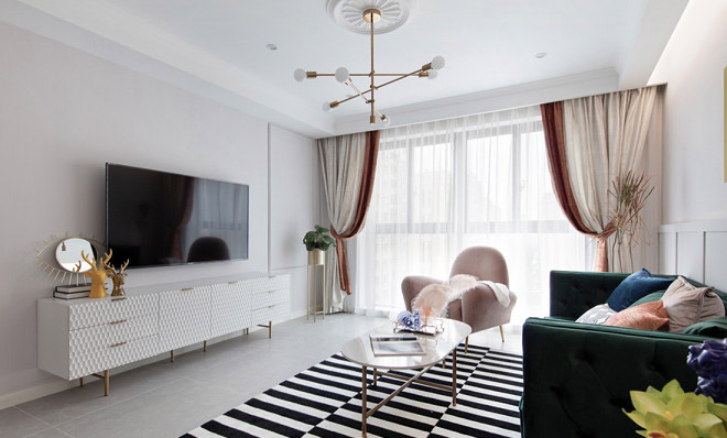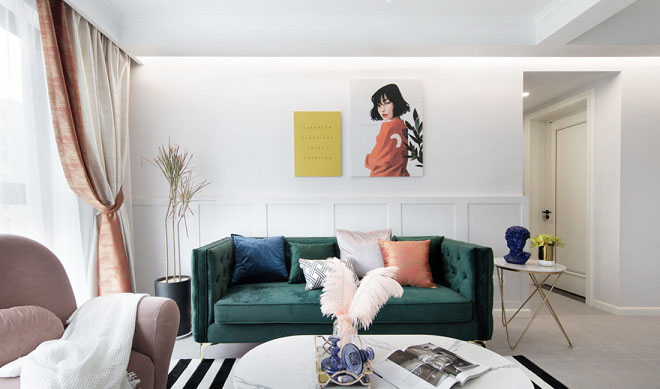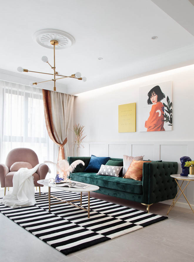 ▲客廳空間以純凈的白色作為主體色,復古的墨綠絲絨沙發(fā),被簡約的淺灰色半護墻襯托的更加醒目。電視背景墻并未做過多復雜的處理,簡單的PU線條帶出些許的造型感。白色的電視柜,表面采用蜂窩紋的設計,十分別致和出挑。搭配精致的金色擺設,令空間感受更為飽滿。