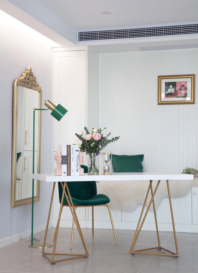 ▲一個人的家,書房就采用開放式的,不會因為隔斷破壞空間整體的美感。一張桌子、一把絨面椅,金色、白色和墨綠色的調和凸顯了質感。置于左側墻面的復古雕花鏡,讓這個閱讀區(qū)兼?zhèn)淞嘶瘖y臺的功能??ㄗ凸耋w的設計,在解決儲物的同時,也增加了一個小小的休閑區(qū)。