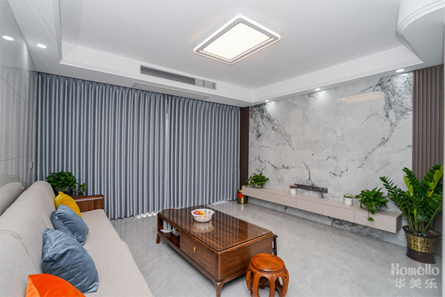 天花做了簡單邊頂,安裝了40*80的平面吸頂燈作為主燈,造價比傳統(tǒng)大吊燈便宜不少,而且滿足客廳的照明需求。配套的家居嘗試了中西合一,現代沙發(fā)保證了就坐的舒適度,中式的茶幾和單人椅放在這里會顯得額外的吸睛,重點是中式茶幾的耐用度更高,收納空間也合理。放眼這個客廳,既有現代的時尚感,同時也帶有一些中式傳統(tǒng)的韻味。