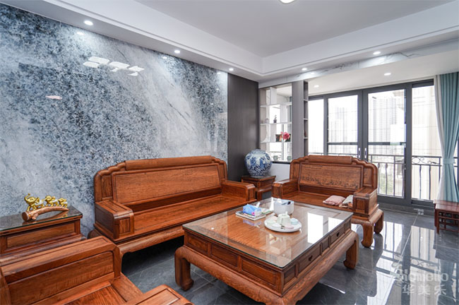 偏廳配套花梨木材質(zhì)多功能功夫茶幾,既能實(shí)現(xiàn)日常的悠閑互動(dòng),又能作為會(huì)客區(qū)與客人進(jìn)行聊天會(huì)談。茶幾旁邊打造了一小面屏風(fēng)柜,放置了一個(gè)古董鐘,提升了偏廳的環(huán)境檔次,側(cè)面還有設(shè)計(jì)了多個(gè)格子柜用于擺放的茶葉等物品,解決了用品擺放的問(wèn)題。