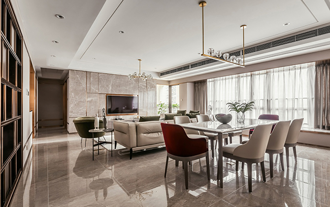 原始戶型優(yōu)點(diǎn)和缺點(diǎn)同樣明顯,客廳餐廳不分區(qū)視野大,四面開窗開門采光好,但每面墻都不對(duì)稱且不完整。硬裝設(shè)計(jì)以電視墻與吊頂為中心建立中軸對(duì)稱關(guān)系,以金屬裝飾線條建立延伸圍合關(guān)系,取消小陽臺(tái)擴(kuò)大廚房空間,全房僅保留兩個(gè)臥室套間和一個(gè)客房兼儲(chǔ)物室。圍繞男主人的喜好和女主人的需求,空間設(shè)計(jì)緊扣現(xiàn)代簡約+雅奢時(shí)尚的調(diào)性進(jìn)行多向發(fā)揮,整體搭配以米金咖作為主基調(diào),背景色基本為米咖色,陳設(shè)主色較之更深濁一層,配色加入不同色相的紅與綠,點(diǎn)綴黑白灰平衡視覺。