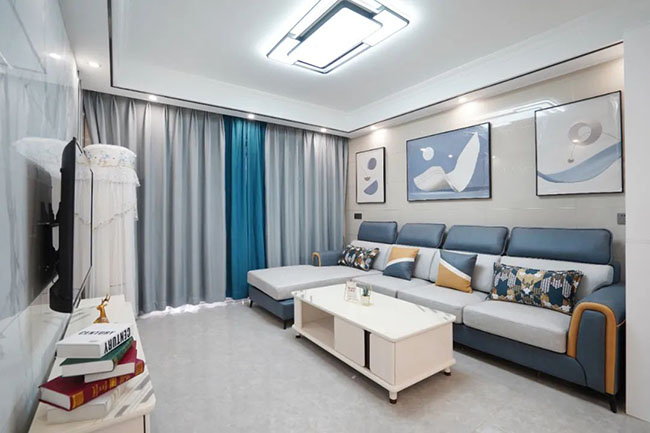 客廳是偏年輕活力型的現(xiàn)代風(fēng)設(shè)計(jì),以藍(lán)白灰構(gòu)筑色調(diào)主旋律,溫暖的淺橙作為點(diǎn)綴,呈現(xiàn)積極陽光的氣息。